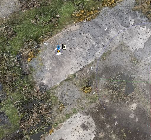 Suspicions that Terra is using an inaccurate transformation between co-ordinate systems can be seen right at the start of the processing. One of our checkpoints is directly at the position of the RTK base station which communicates corrections to the drone during flight. By loading the drone data as ETRS89 into Terra, but loading the checkpoints in their native OSGB we can instantly see the discrepancy, even before full processing of the raw LiDAR data.